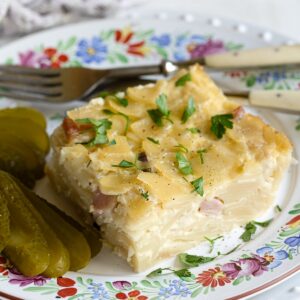 Note: Hot Šunkofleky casserole may tend to fall apart when sliced. This is normal, so don't worry. As the dish cools, it will firm up and hold its shape better. It will taste just as delicious in both scenarios!